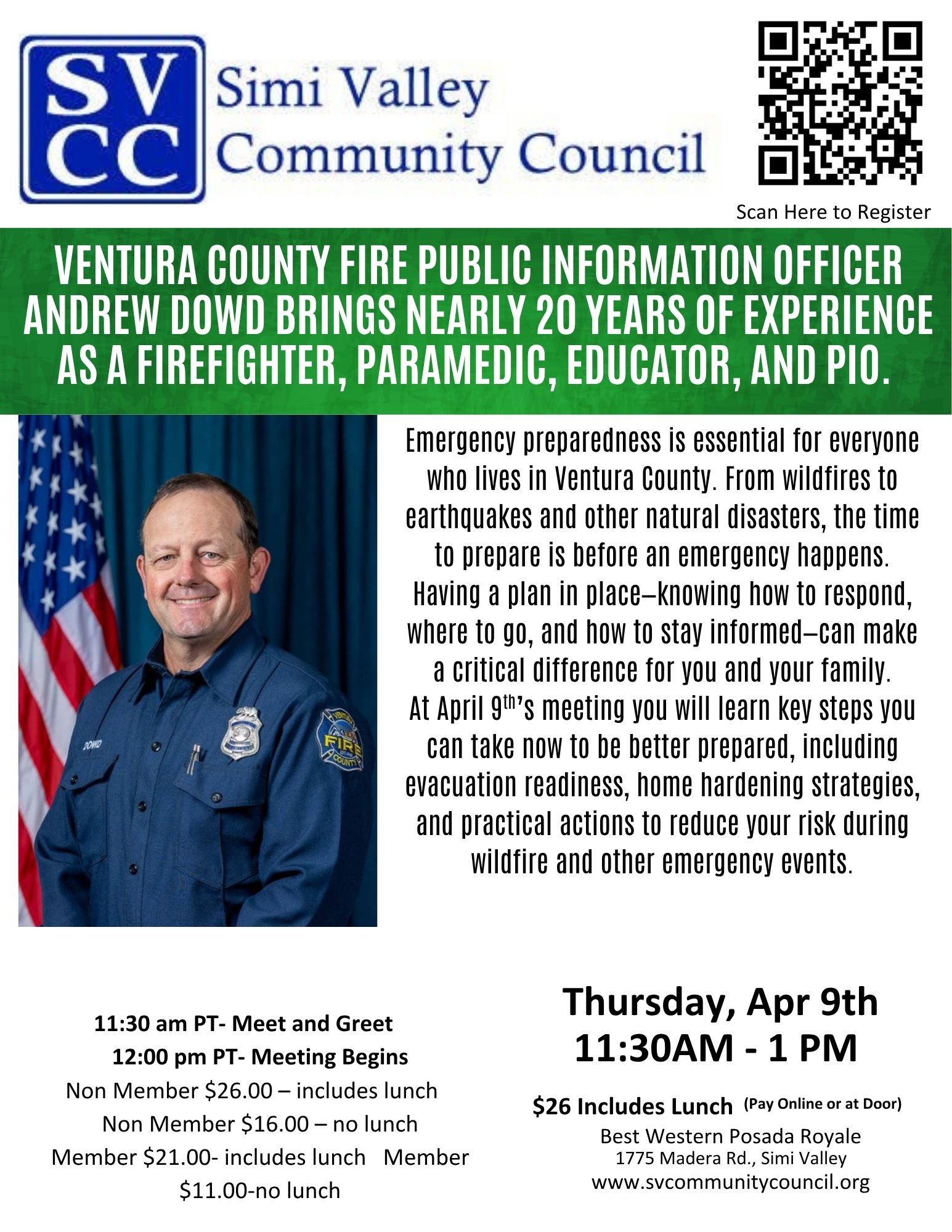 Ventura County Fire Public Information Officer Andrew Dowd brings nearly 20 years of experience as a firefighter, paramedic, educator, and PIO. He has responded to major incidents including the Thomas and Woolsey Fires, and served as a Public Information Officer during the Mountain Fire
